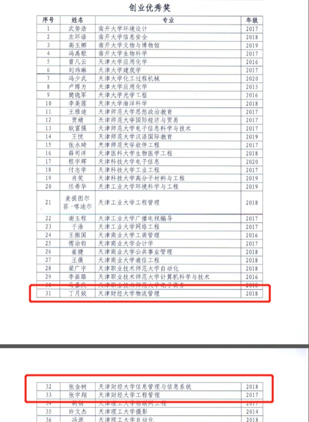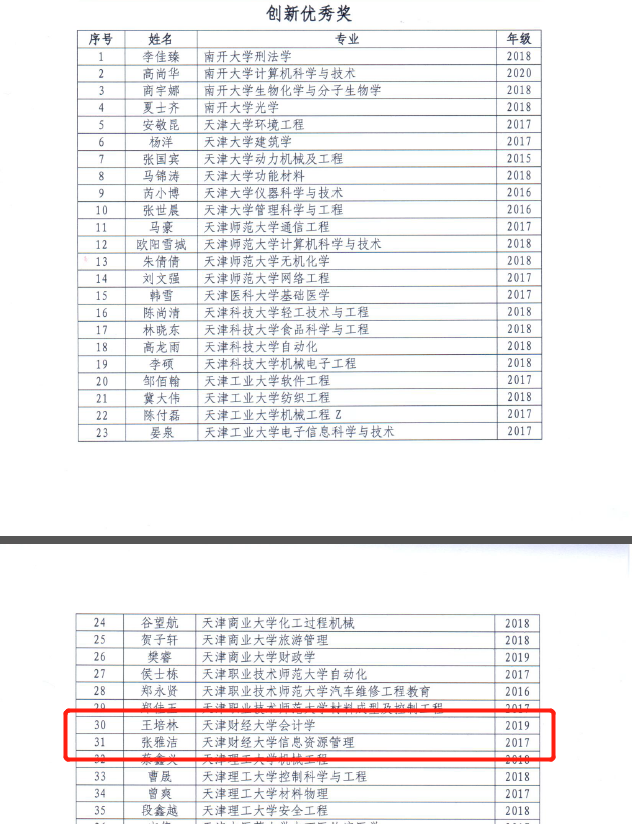 信息资源管理专业2017级本科生张雅洁获天津市大学生创新奖学金优秀奖,信息管理与信息系统专业2018级本科生张金树、工程管理专业2017级本科生张宇翔获天津市大学生创业奖学金优秀奖。