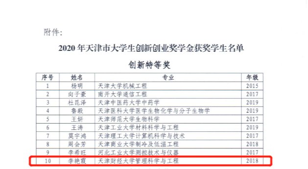 近日,2020年天津市大学生创新创业奖学金评选结果揭晓,我学院共有4名学生获得2020年天津市大学生创新创业奖学金,其中2018级管理科学与工程专业硕士研究生李艳霞被授予天津市大学生创新创业奖学金特等奖。2020年“天津市大学生创新奖学金特等奖”仅10人获得。