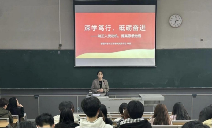 本次培训邀请了管科学院党委书记单喆为积极分子讲授第一节课。单喆老师以“深学笃行,砥砺奋进——端正入党动机,提高思想觉悟”为题,带领同学们一起学习习近平总书记视察天津重要讲话精神,并深刻领会新质生产力的重要内涵,鼓励同学们矢志创新,大力弘扬科学家精神。最后,单喆老师对大家提出展望,希望大家能够树立正确价值观,积极践行时代使命。