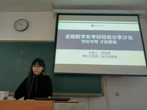 本次交流会特别邀请了来自金融数学系的考研成功学生代表:田甜甜、尹安然、何易霏,以他们的亲身经历,为在场的同学们分享了宝贵的考研经验。同时,邀请了管科学院博士生李安琪,为同学们介绍读博期间的科研工作与生活经历。