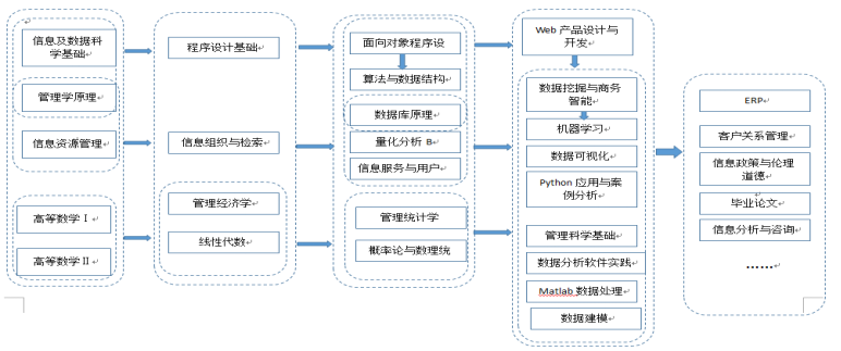 包括信息组织与检索、信息分析与预测、管理统计学、计量经济学、数据库原理与应用、数据挖掘与商务智能、机器学习、数据分析软件实践、Web产品设计与开发、信息服务与用户、程序设计、ERP、CRM等等(主要专业课修读导图如下图所示)。