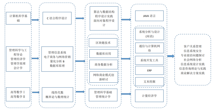 会计学、管理统计学、计量经济学、管理学原理、管理科学基础、管理信息系统、C语言程序设计、Python程序设计、系统分析与设计、ERP、数据库原理、算法与数据结构、电子商务与网络营销、商务数据分析、信息咨询理论与实践、区块链技术、文本挖掘、网络商业模式创新、社会网络分析等。专业课程导修图如下图所示。