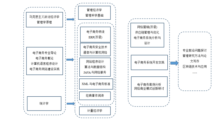 电子商务概论、网络营销、电子商务网站设计、电子商务物流管理、供应链管理与优化、电子商务系统分析与设计、XML与电子商务标准、电子商务安全技术、电子商务前沿技术与应用、客户关系管理、计算机语言程序设计、算法与数据结构、数据库原理与应用、管理学原理、管理科学基础、管理经济学、会计学、金融学、统计学、计量经济学等。专业课程导修图如下图所示。