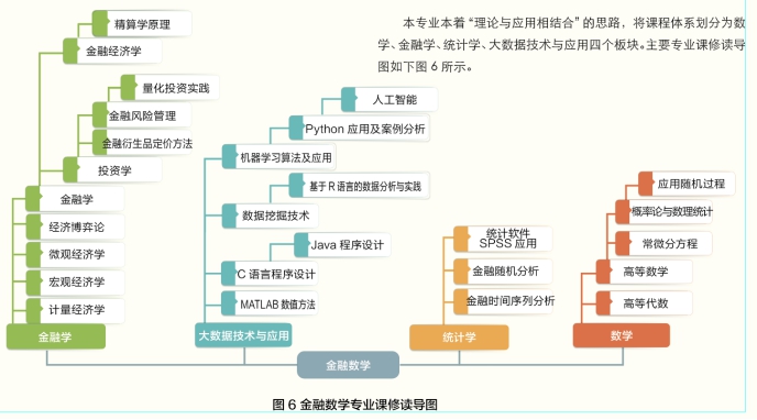 本专业本着“理论与应用相结合”的思路,将课程体系划分为数学、金融学、统计学、大数据技术与应用四个板块。主要专业课修读导图如下图6所示。